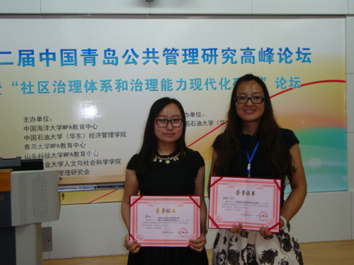 教师金晓蕊、甘月文及MPA研究生原妍如应邀参加了会议。金晓蕊、甘月文提交的论文《我国城市社区治理主体和谐共生关系探讨》、原妍如提交的论文《政府购买公共服务:社区建设发展的有效途径》均获会议颁发的优秀论文奖。在互动交流环节,我校MPA研究生原妍如的发言受到会议点评专家的高度赞许。
