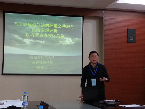 教师陈佳志应邀参加了在北京航空航天大学召开的第二届环境治理和可持续发展国际会议,并在此次会议宣读了学术论文。其论文《基于表述偏好法的环境公共服务供给主观评价-以内蒙古农牧区为例》,引起与会学者广泛关注与讨论。此次会议由北京航空航天大学、台湾大学、《中国行政管理》杂志社共同主办,会议的主要议题是环境治理和可持续发展:协作、协商及责任。来自台湾、美国、蒙古和中国大陆等世界各地的学者汇聚一堂,针对环境评估与评价、环境冲突解决、环境政策与可持续发展、环境协同治理等当代人类所面临的生态环境问题进行了广泛而深入的讨论与交流。