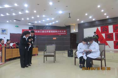 本届公共案例分析大赛共分为两个环节,第一环节为团队亮相,其中五支优秀的团队以新颖的话剧,舞蹈,三句半等做为团队亮相项目;第二环节为成果展示,五支队伍以时政要闻以及百姓生活作为题材,用充分的准备,细致的实地调查,严谨的逻辑思维,精准简洁的语言表达为每一个案例作出精彩的分析,赢得阵阵掌声。