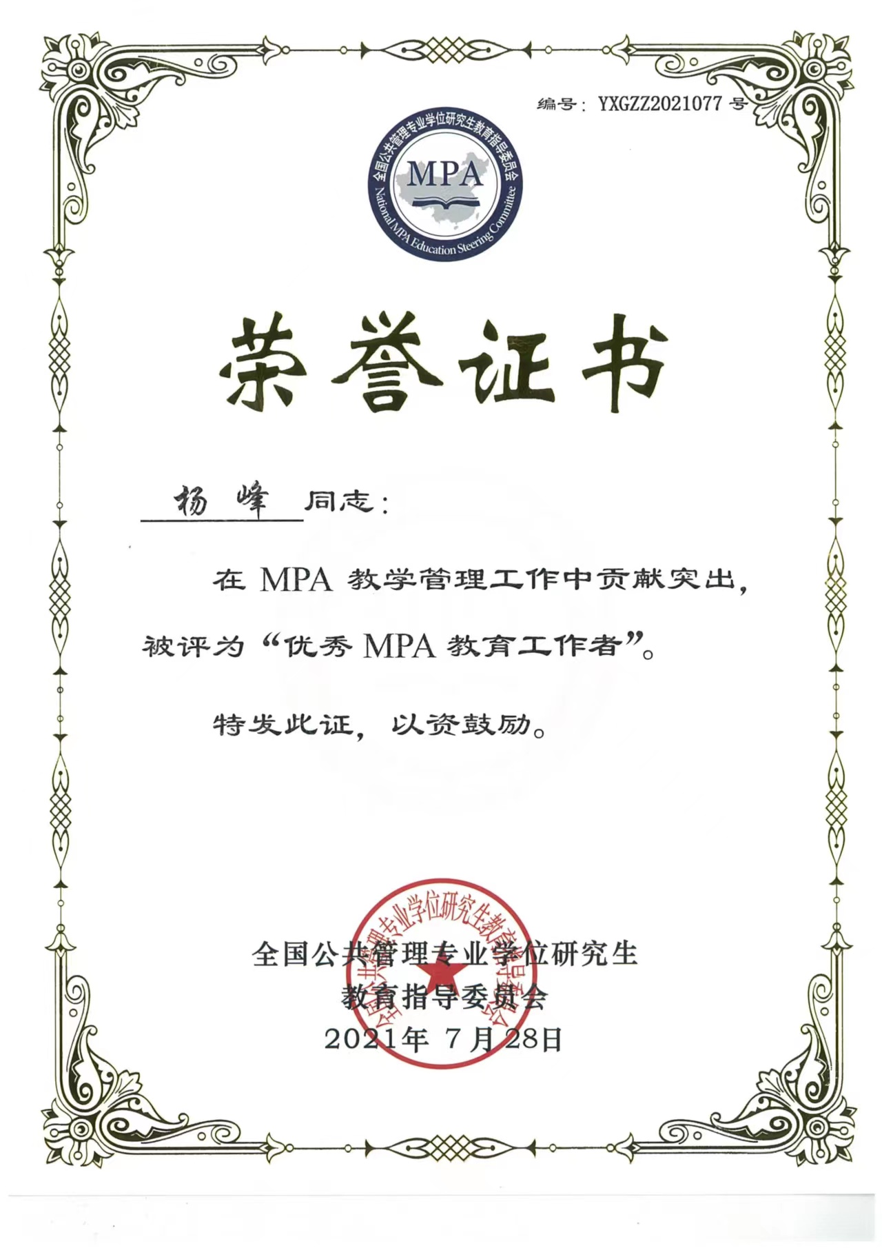 院长拓俊杰教授、MPA中心主任杨峰老师分别获评第三届全国“优秀MPA教师”、“优秀MPA教育工作者”荣誉称号。