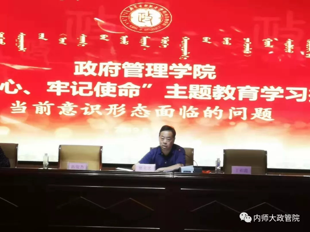 党总支书记樊荣忠老师就目前社会上所普遍存在的意识形态问题做了“不忘初心、牢记使命”主题教育报告。表示意识形态是一种极端重要的工作,要树立正确的思想意识避免错误思潮的影响。在中华人民共和国成立七十周年到来之际,作为当代大学生要培养爱国情怀并要努力学习科学文化知识,坚定“四个自信”,为社会主义事业而奋斗。